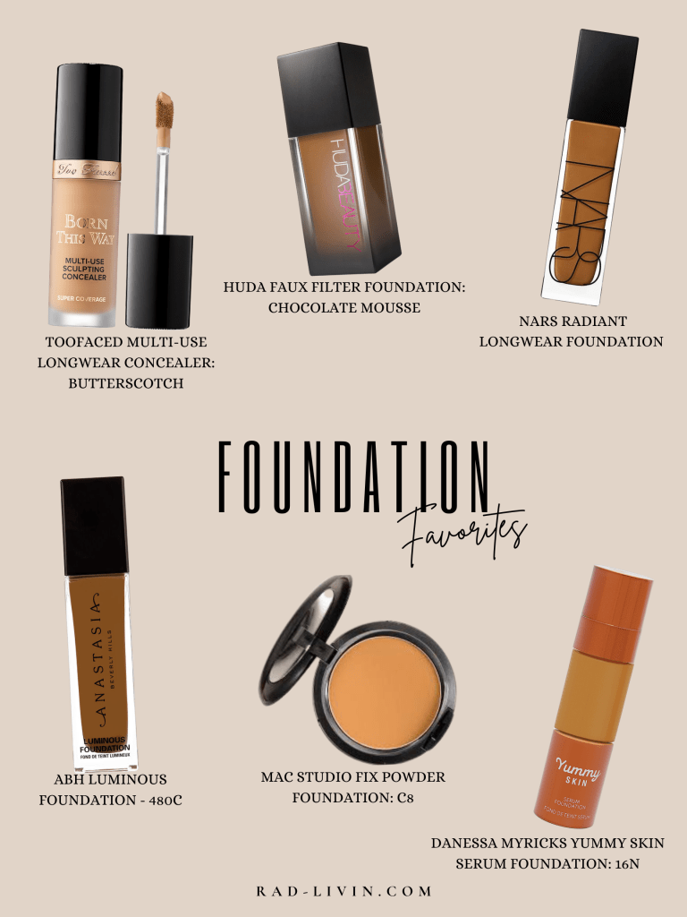 There’s a few things that all my favorite foundations have in common. They must be dry skin friendly, medium to full coverage, a thorough shade range with olive undertones, and wear well for at least 8 hours. MAKEUP HACK: my favorite way to achieve a “No Makeup, Makeup Look” is to conceal with the TOO FACED multi sculpting concealer and use the MAC foundation powder for the rest of the face. I love using this “no foundation” technique because it takes 2 minutes!
